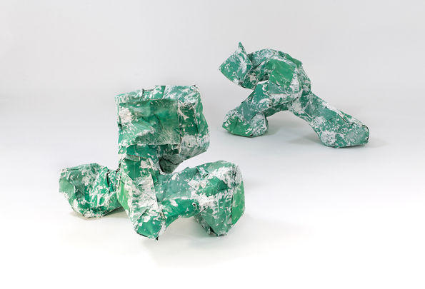 When the puzzle is solved, the work is finished: an ensemble of lumpy sculptures stand on their own. Their irregular surfaces refract against each other in a play of lines and color that enhances the distinctive geometry of each one.